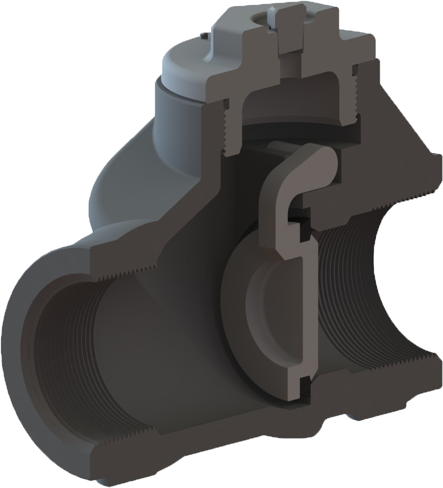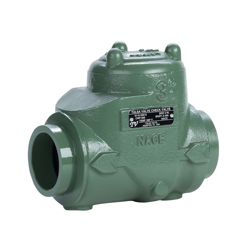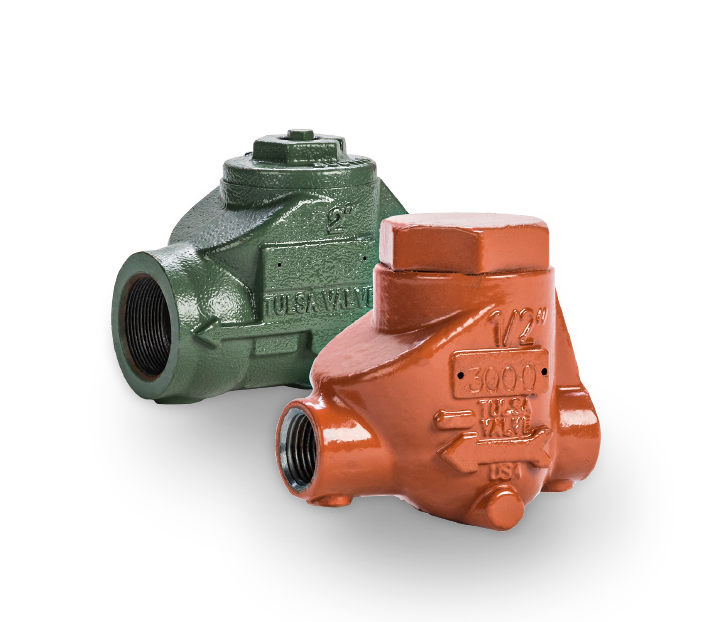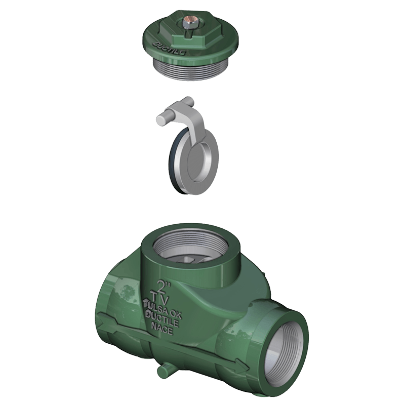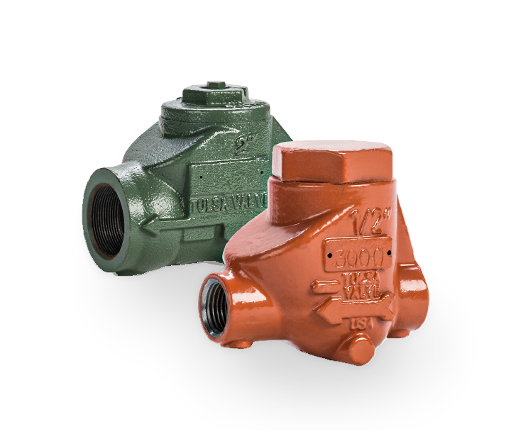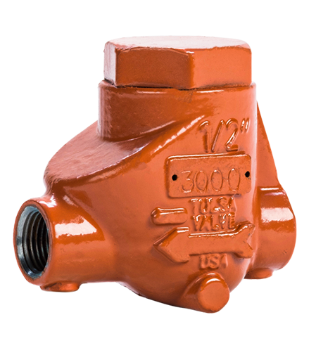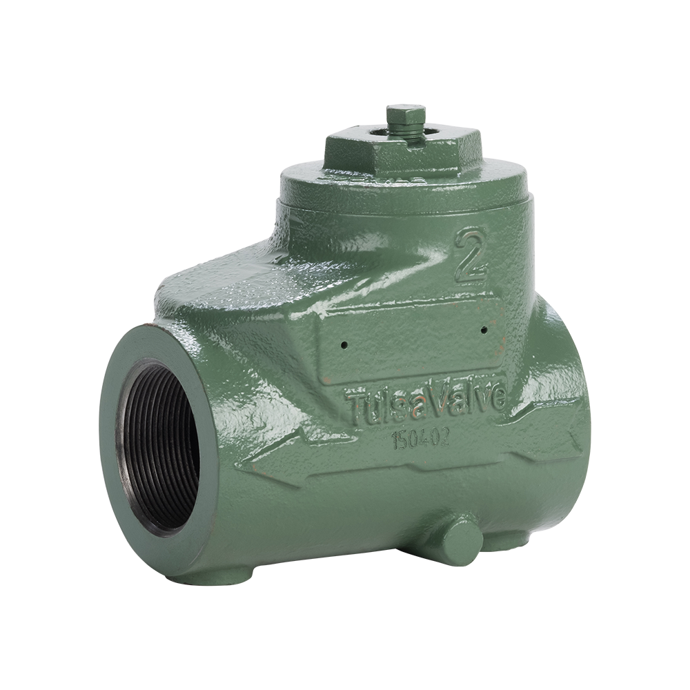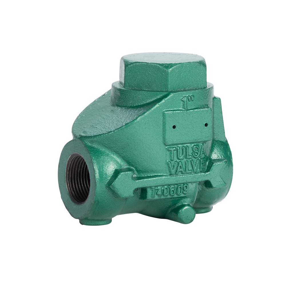 Tulsa’s threaded swing check valves are high-quality check valves assembled and tested in Houston, Texas. Our swing check valves are available in ductile iron or carbon steel. All of our threaded swing check valves conform to NACE MR0175 requirements to meet your corrosive service needs. The clapper and seat design are beveled and self-aligned to ensure zero leakage. The molded clapper seal design ensures a seal at one (1) PSI differential. Our design provides a full bore opening to ensure a very low-pressure drop. Tulsa Valve performs 100% pressure testing to API 598 standards on all of our swing check valves.